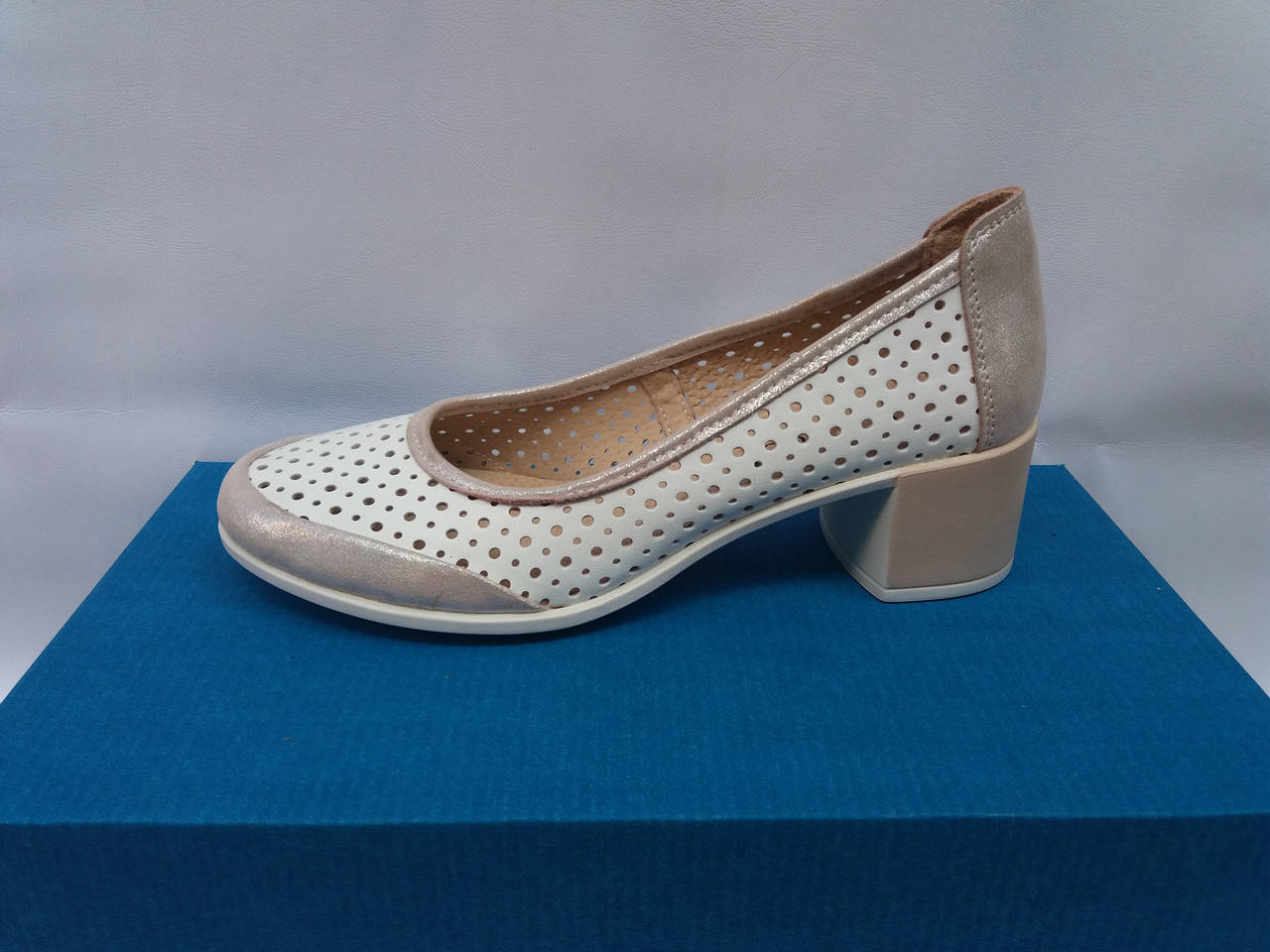 Закрытые кожаные босоножки на каблуке с прекрасным сочетанием цветов белого с бежевым Очень удобные и красивые босоножки подойдут под любой наряд и станут вашими любимыми.Перфорированая кожа на наружной и внутренней части модели.