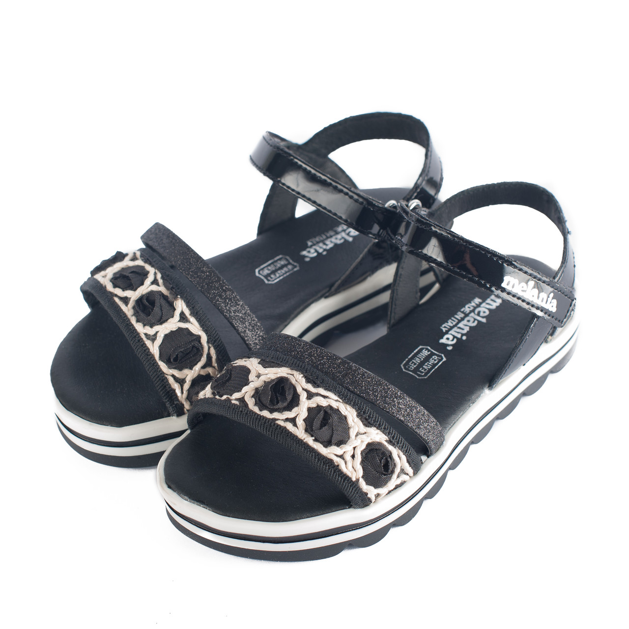 [html]Босоножки на липучке, на носочке толстая шлейка украшенная цветами с белым кантом, тонкая шлейка-глиттером.[/html]