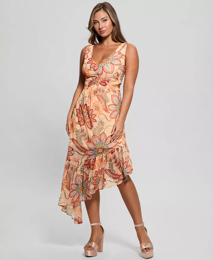 Женское платье Sabrina с принтом и асимметричным подолом с рюшами GUESS, коричневый