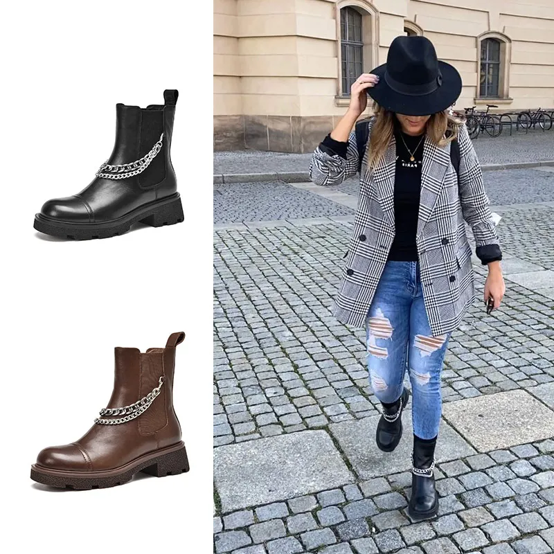 Ботинки Челси женские на платформе, из коровьей кожи, со съемной резинкой и серебряной цепочкой, декорированные дамские ботильоны ручной работы BeauToday 03554