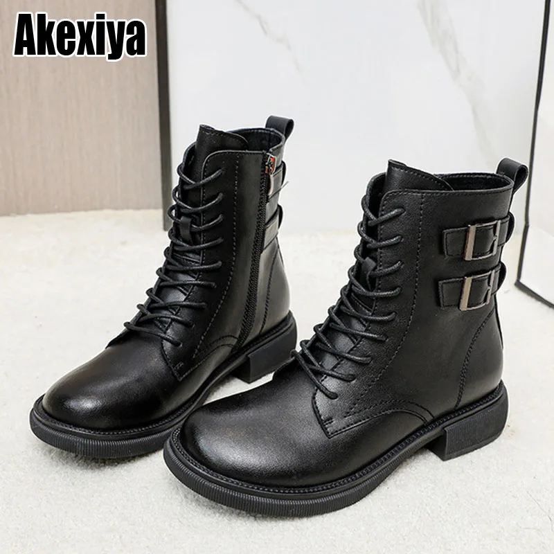 Ботинки женские короткие из натуральной кожи, на плоской подошве, с пряжкой
