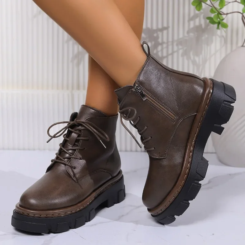 Ботинки женские однотонные на платформе, дизайнерские модные ботинки из искусственной кожи, на шнуровке, с круглым носком, в стиле ретро, зимний сезон