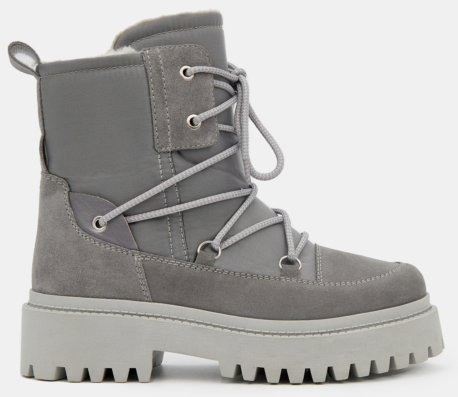 Обувь оснащена шнуровкой, благодаря которой можно регулировать объем голенища. За счет этого ботинки удобно носить с теплыми носками. Высокий подъем и небольшой каблук делают их комфортными для длительных прогулок. Модель представлена в универсальном сером цвете, поэтому подойдет практически к любому образу.