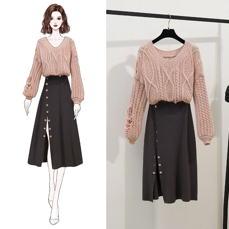New Pullover Sweater & Split Long Skirt Leisure Suits Korean Fashion Autumn Fairy Two-Piece Clothing Set Knitwear Loose Top