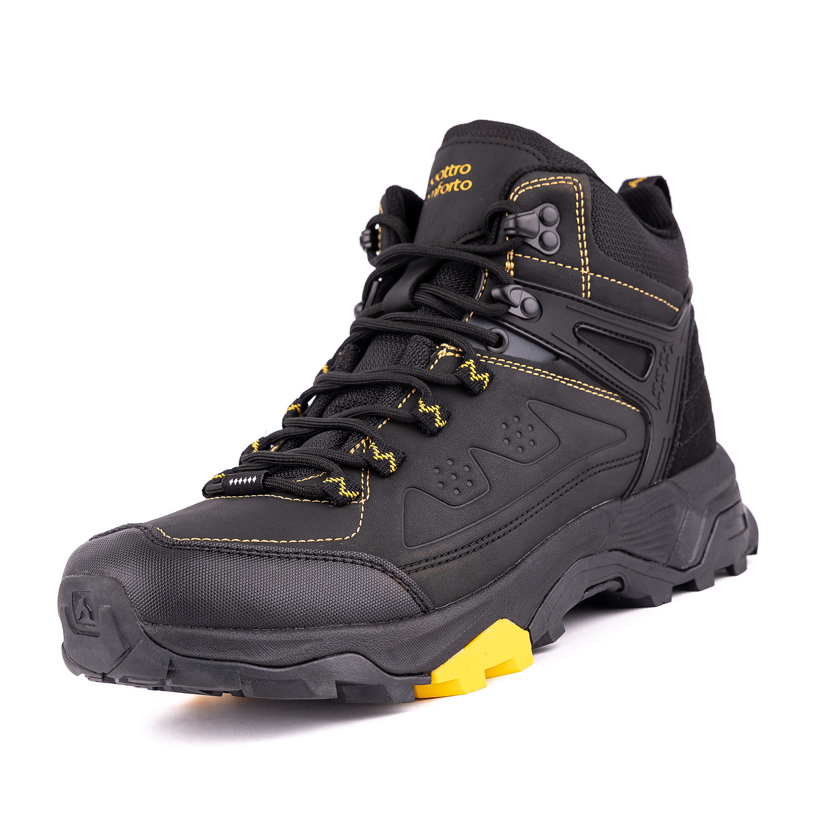Мужские зимние ботинки треки Quattrocomforto. Черные теплые треккинговые ботинки на шнурках - стильная обувь для мужчин для повседневной носки или активного отдыха на зиму. Мужские ботинки треки имеют теплую съемную стельку из искусственного меха, которая не даст вашим ногам замерзнуть. Подкладка из искусственного меха защищает ноги от холода и увеличивает срок службы обуви. Мягкие мужские высокие треккинговые ботинки из экокожи износостойкие, водонепроницаемые и прочные. Стильные ботинки для прогулок обладают легкой и непромокаемой подошвой из ЭВА, имеющей достаточную степень амортизации. Зимние ботинки треки с овальным носом представлены в широкой размерной сетке - выберите подходящий вам размер обуви по таблице размеров в галерее фотографий. Мужские черные закрытые ботинки треки подходят на узкую ногу. Современные модные городские ботинки могут дополнить спортивные и классик образы женщин. Массивная платформа обуви позволяет использовать их в качестве треккинговых или походных. Не скользящая и непромокаемая подошва - обязательный атрибут качественной обуви. Ботинки в стиле тактической обуви помогут дополнить модный туристический образ. Тактические мужские ботинки треки поддержат твое чувство стиля. Обувь Quattrocomforto предназначена для мужчин и женщин, выбирающих комфорт, практичность и качество. Обувь Кватрокомфорто производится преимущественно из натуральных материалов, с учетом модных тенденций, с учетом функциональности и удобства. Не кари себя за любовь к Quattrocomforto.