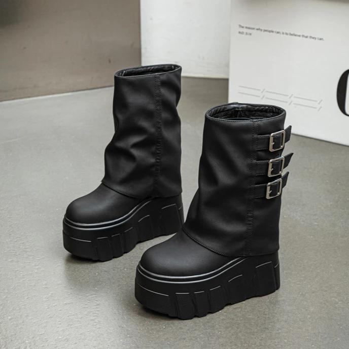 Ботинки на платформе Женская обувь Осень Зима Новые Женские Кожаные Ботинки с Пряжкой Ремня Ультра Высокий Каблук Женские Ботинки Botas Femenina 38 чёрный