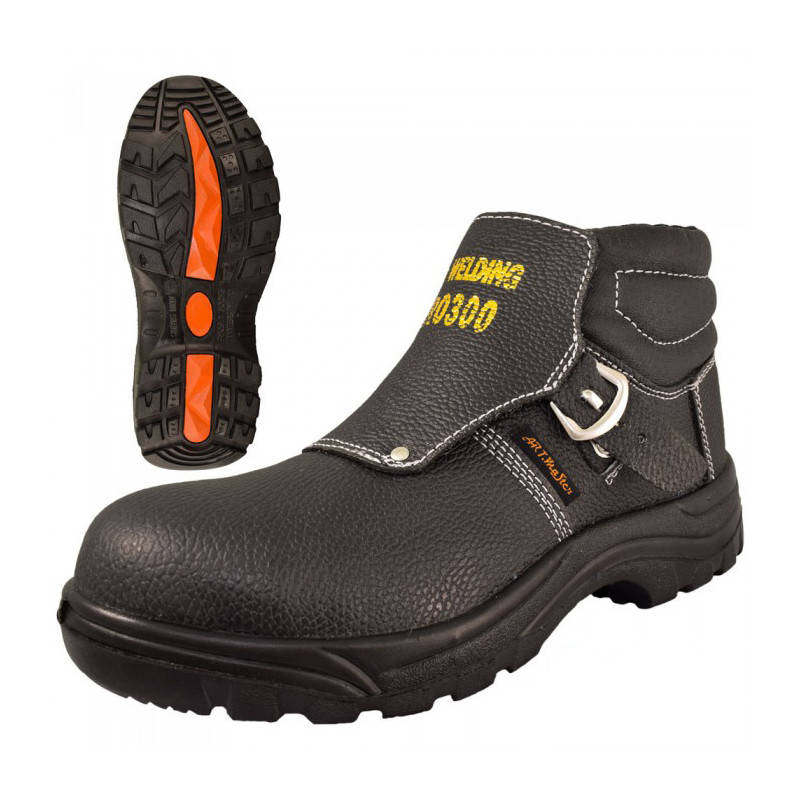 Защитная обувь сварщика со стальным подноском и стальной устойчивой к проколам вставкой из воловьей кожи с тиснением черного цвета. Конструкция верха оснащена внешним язычком для предотвращения попадания осколков внутрь обуви. Защищенная пряжка позволяет быстро расстегнуть ремешок.