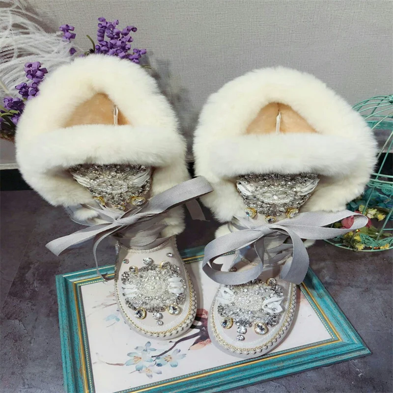 Ботинки ручной работы с кристаллами и бисером, высокие зимние ботинки, жемчужные, легкие, яркие, теплые и удобные, Размеры 35-44