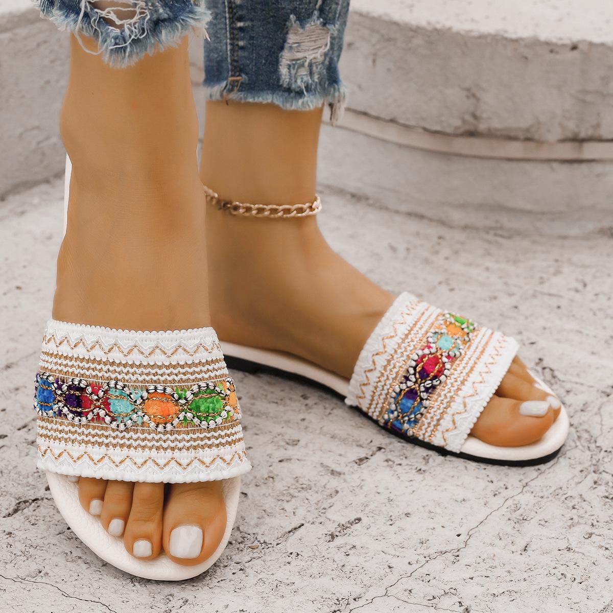 Бохо плоские тапочки с открытым носком, женская летняя новая модная верхняя одежда, цветочные женские тапочки, женская обувь большого размера 36 белый