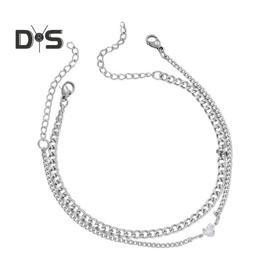 Браслет для пар, 2 шт., простой стиль, нержавеющая сталь, стразы, сердце, регулируемая длина, удлиненная цепочка, полированная, нержавеющая, легкий, подарок для любви, унисекс серебряный