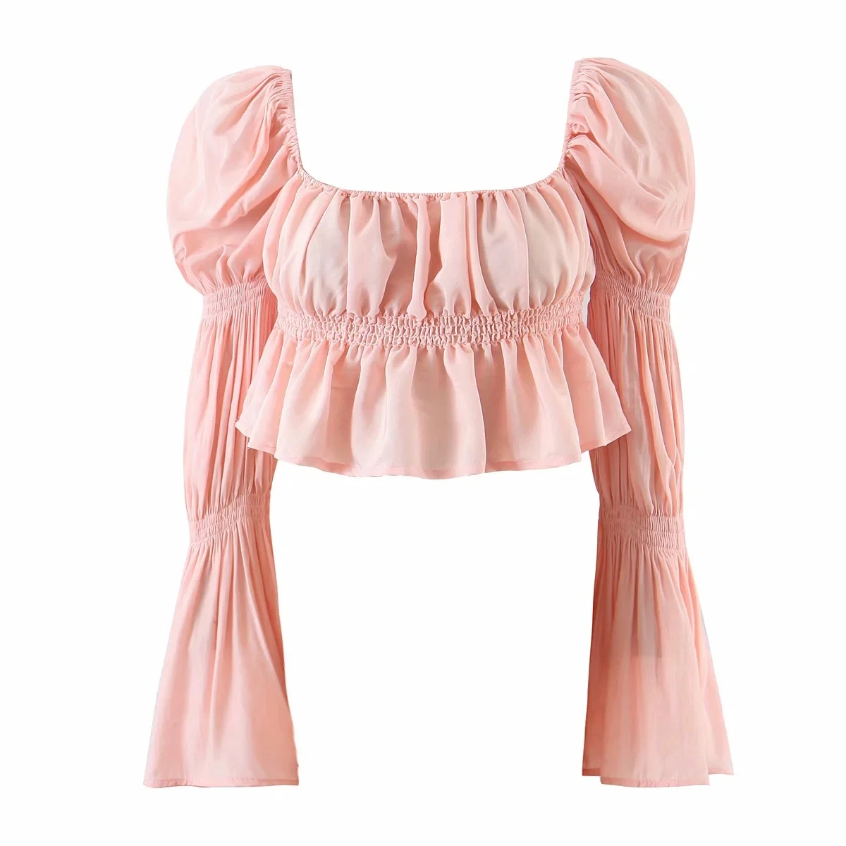 New Women Solid Color Flare Sleeve Blouse Sexy Square Neck Fashion Crop Top Female Holiday Summer Blusas Roupas Tops