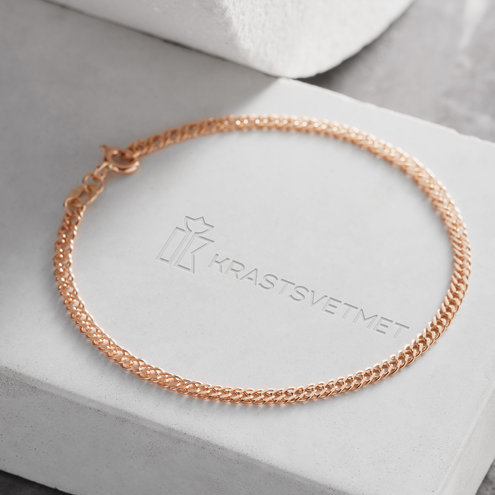 Браслет Ромб двойной из красного золота KrastsvetmetДвойной ромб зарекомендовал себя как плетение независимое и устойчивое к изменениям. Плоское полотно браслета не перекручивается при движении, а рисунок звена актуален для любого стиля и модного течения. Ромб оценят любители классики и поклонники авангарда, романтичные натуры и прагматики.Ширина цепи: 2,6 мм, диаметр проволоки 0,4 мм.Качество сплава подтверждено государственным пробирным клеймом 585. Вес ювелирного украшения указан средний, он может отличаться незначительно. Гарантию высокого качества несет компания ОАО Красцветмет.Внимание! Выполнен по технологии пустотелого плетения, которое позволяет создавать массивные, но легкие и ажурные украшения. Облегченные украшения требуют более внимательного обращения, бережного ухода и хранения.
