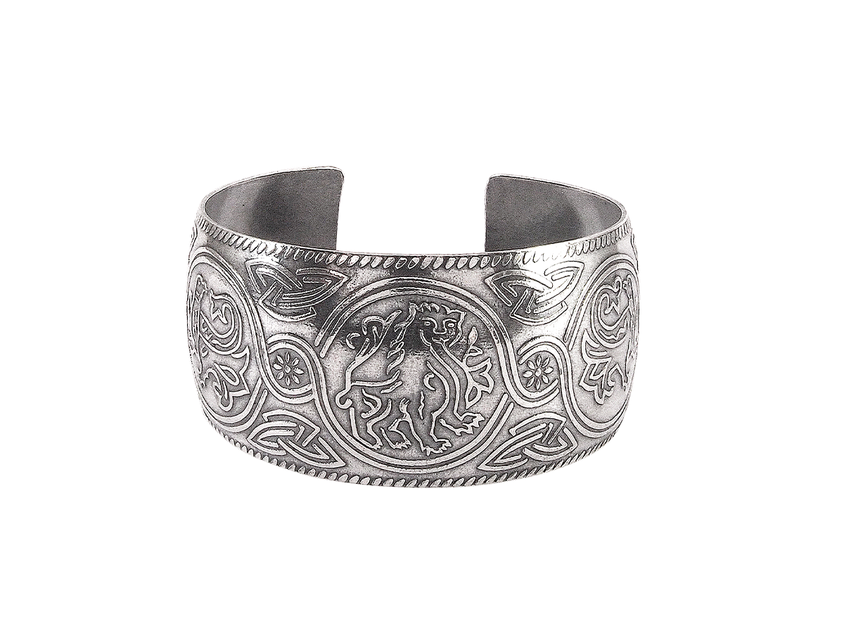 Браслет с пожеланием мира, благополучия и защищенности. Поднятые крылья птиц символизируют творческий полёт души, а ростки на их концах пожелания процветания. Лев означает не только высокое положение в обществе и власть, но и устойчивое благосостояние. Бесконечные узелки, окружающие узоры ловушки из которых нет выхода для всякого бестелесного зла (зависти, недобрых глаз). Браслет по мотивам белокаменной резьбы со стен собора Рождества Богородицы в Суздали. XIII в.