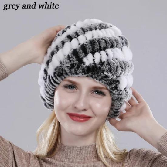 Брендовые женские шапки из натурального меха кролика Рекс, зимние шапки из меха кролика Рекс, полосатый топ с цветочным мехом лисы, теплые вязаные шапки из натурального меха серый белый