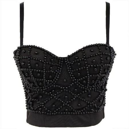 Women Sexy Spaghetti Strap Bustier Bra Imitation Pearl Beaded Push Up Camisole Vest Club Party V-Neck Corset Crop Top