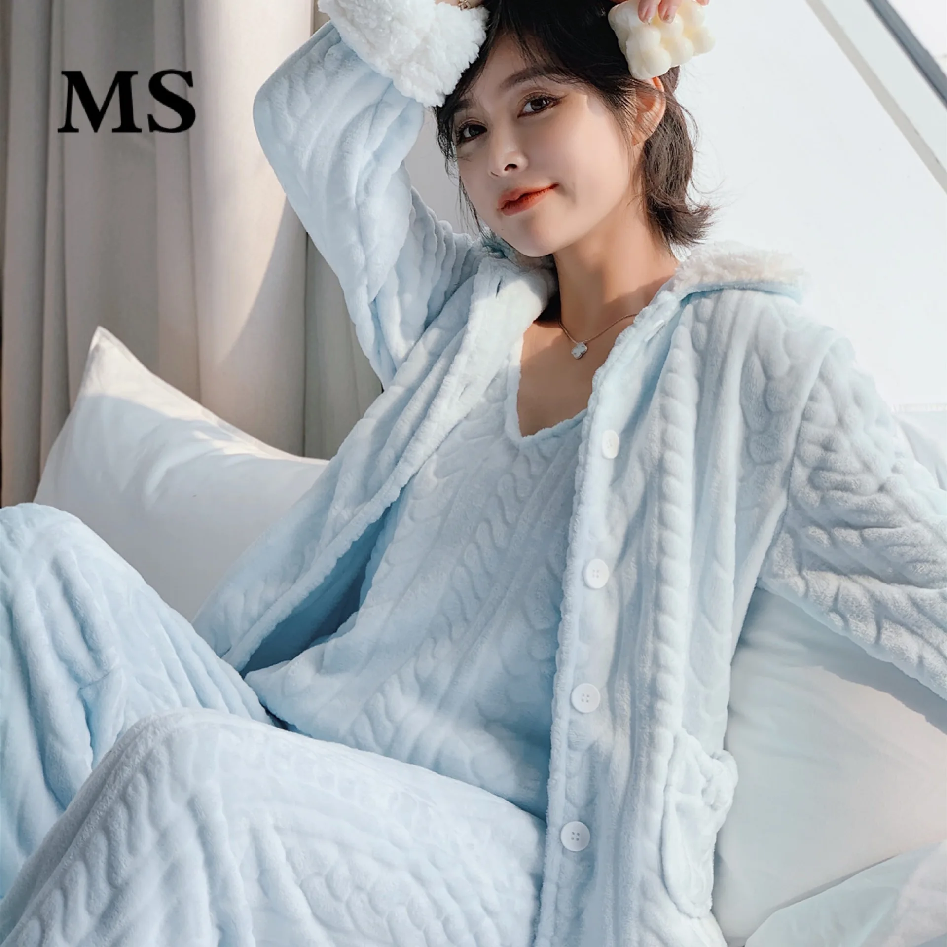 MS Autumn and winter flannel Korean version of the home service Princess wind sweet three-piece pajamas color matching set