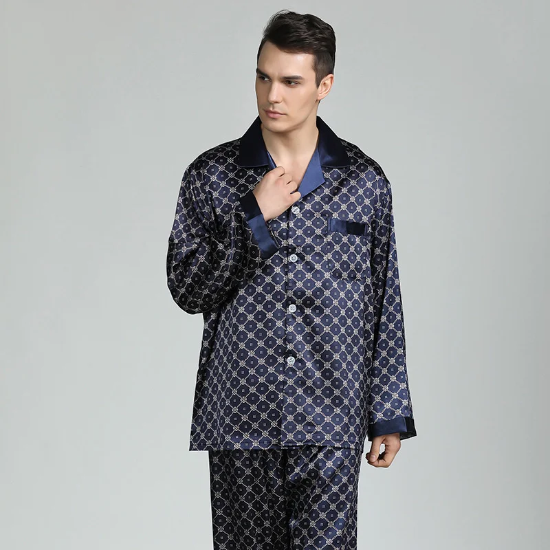Casual Sleepwear Men Pajamas Set 2PCS Sirt&Pants Satin Faux Silk Nitwear Print Pijamas Soft PJS Set Intimate Linerie