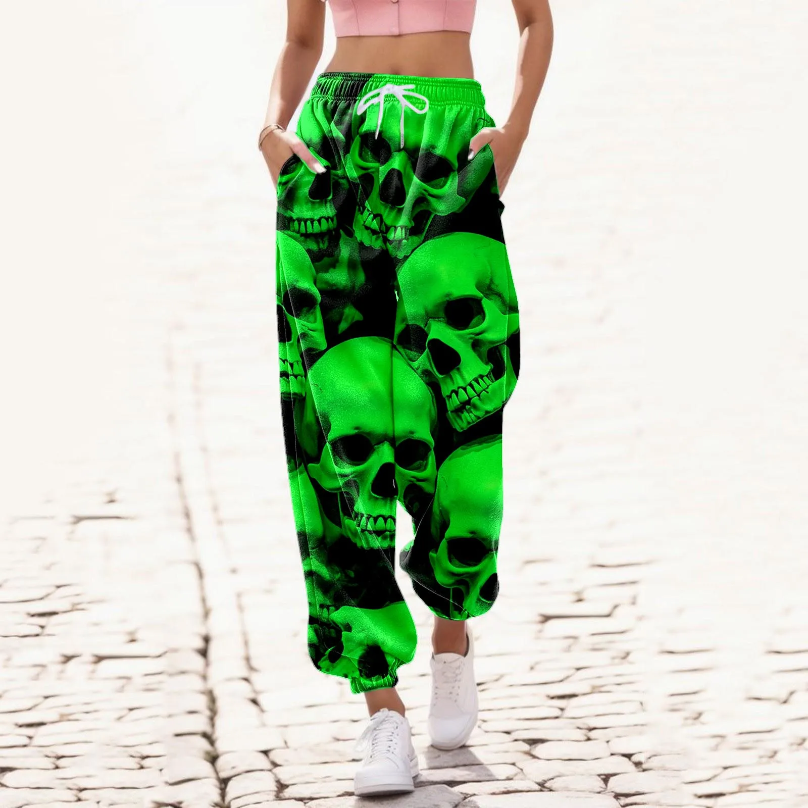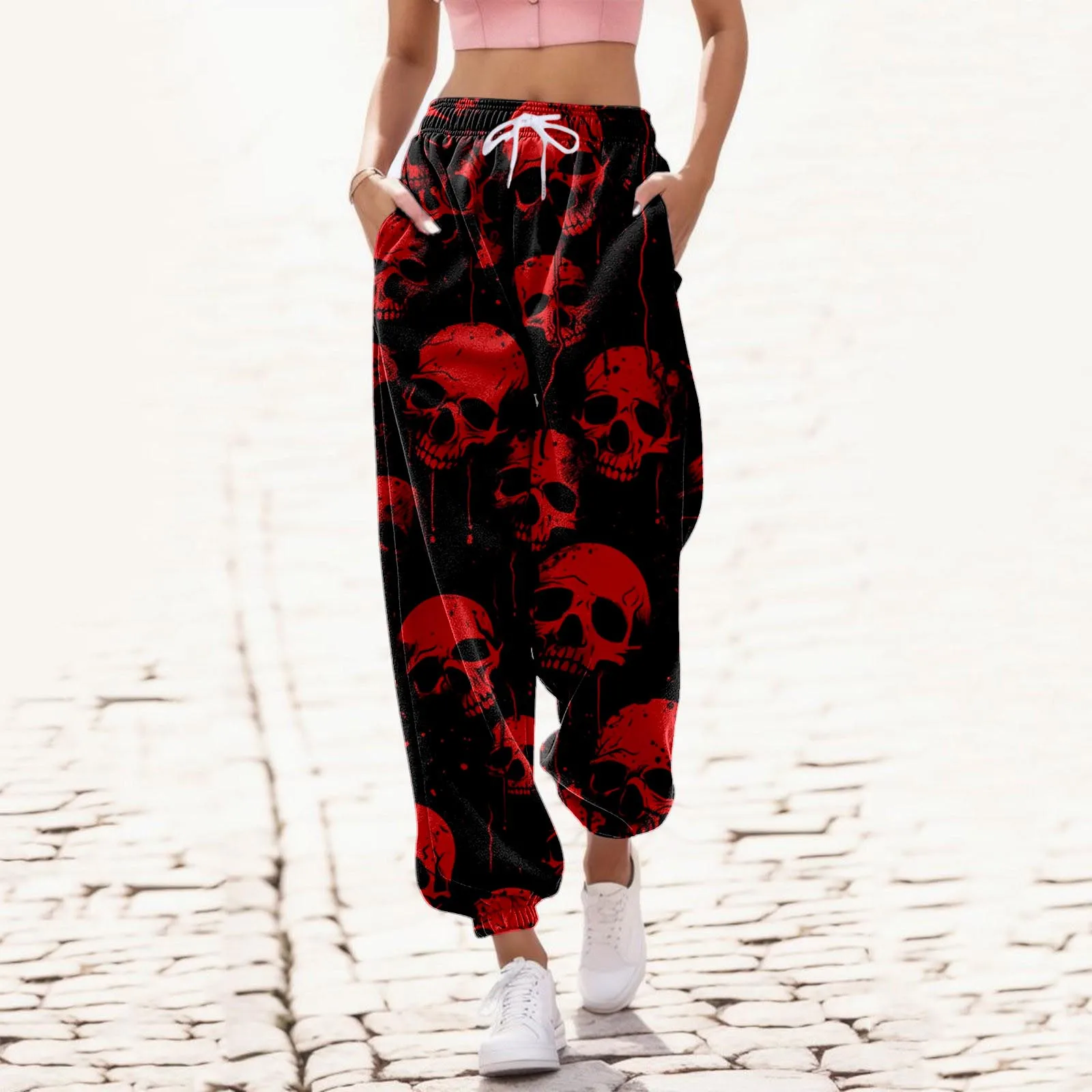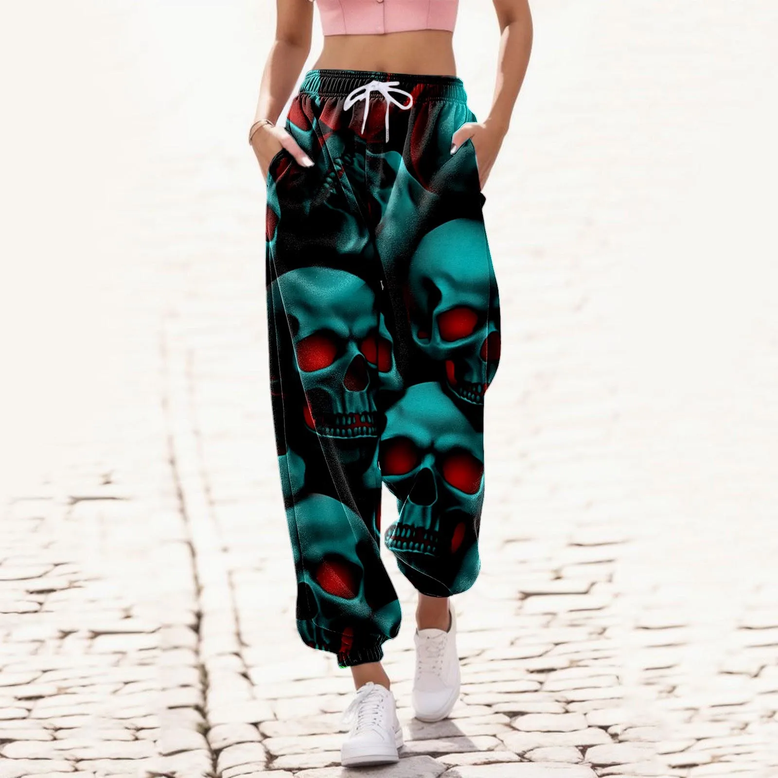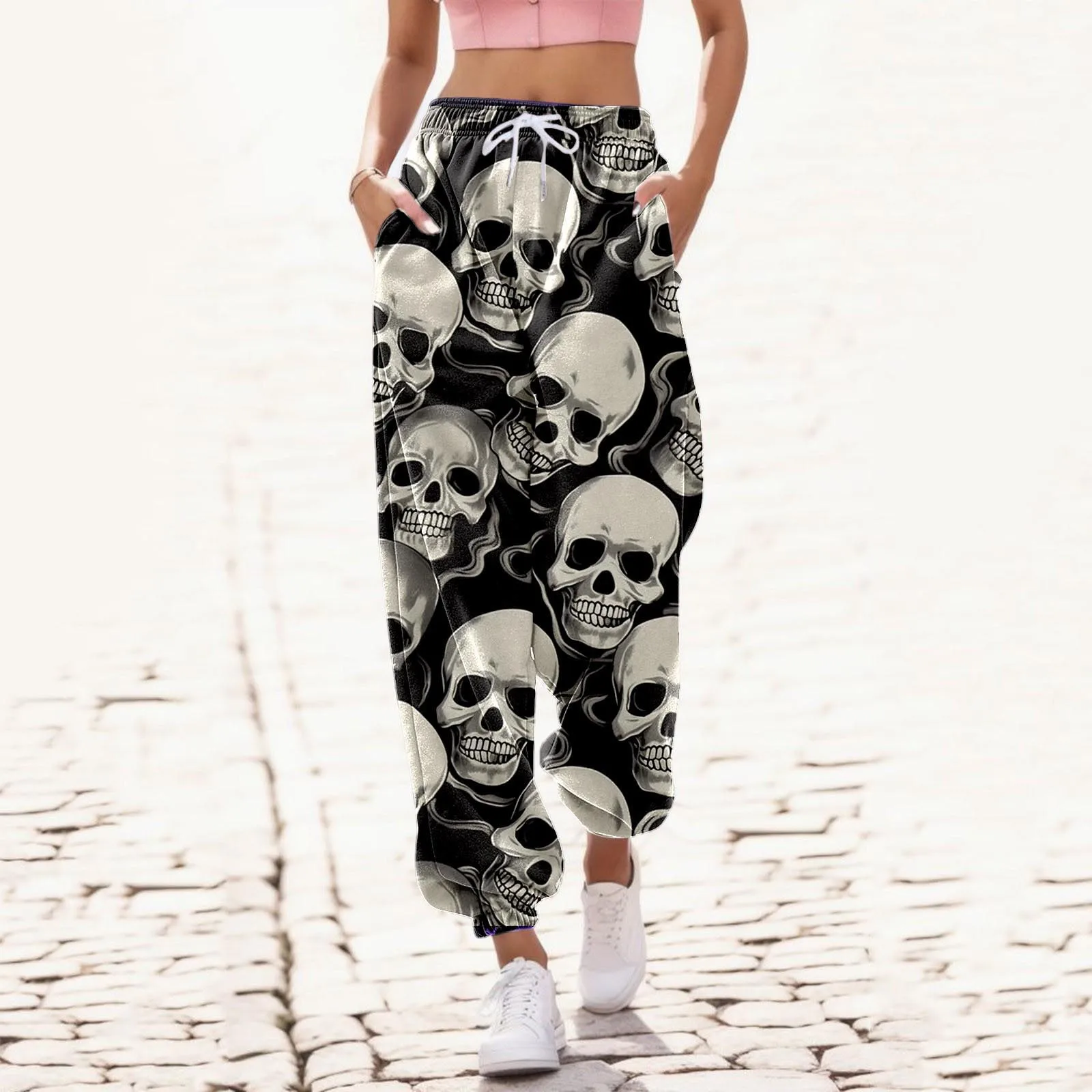 Брюки женские винтажные в стиле Харадзюку с высокой талией и принтом черепа