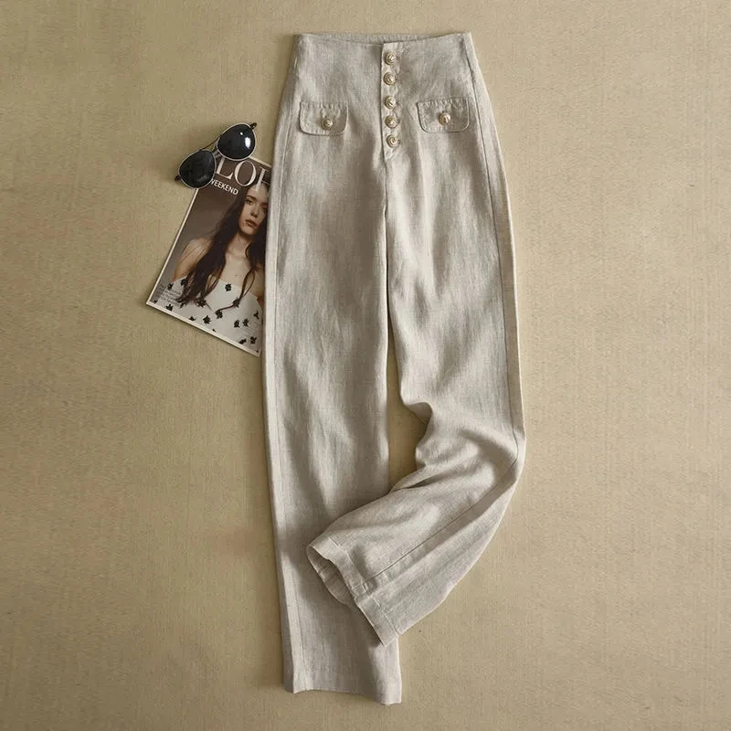 Брюки женские льняные с широкими штанинами, офисные повседневные штаны из хлопка и льна с завышенной талией, весна-лето