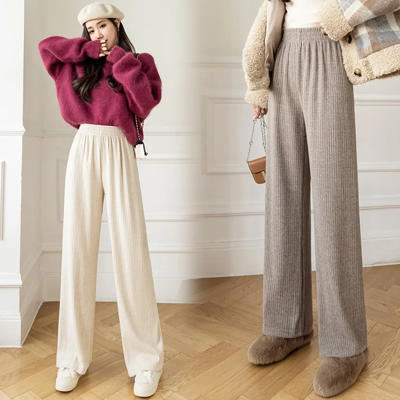 Брюки женские трикотажные полосатые с широкими штанинами и высокой талией