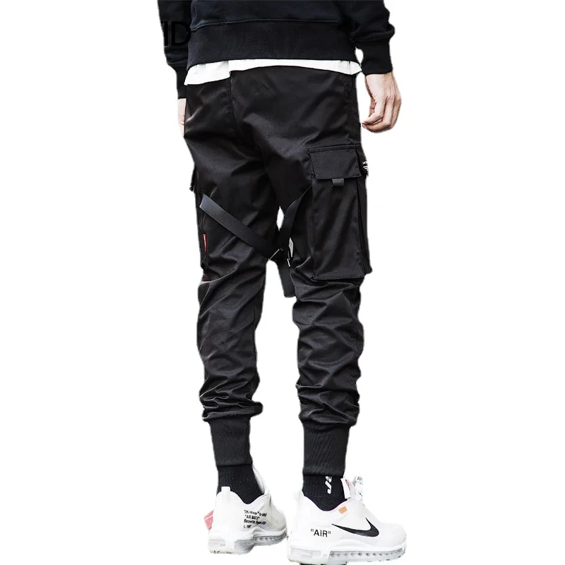 Брюки-карго мужские с лентами, черные джоггеры-султанки с множеством карманов, спортивные штаны в стиле Харадзюку, повседневные брюки-султанки в стиле хип-хоп
