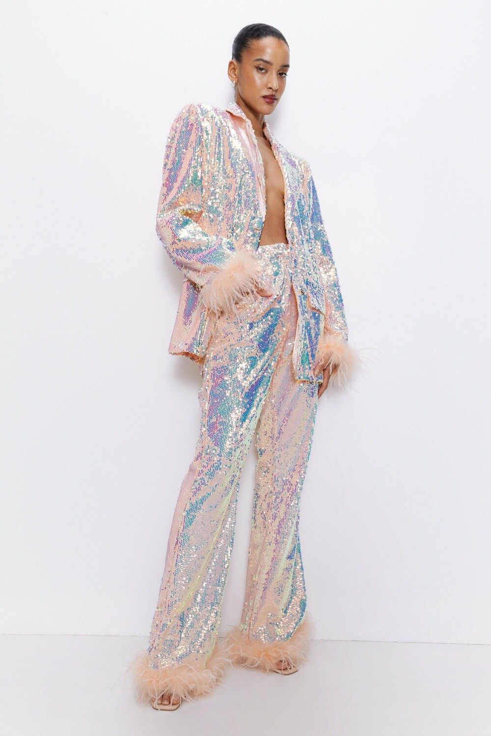 Добавьте немного блеска. Почувствуйте себя смелым в наших брюках-клеш, выполненных из высококачественной ткани с пайетками переливающейся расцветки и забавной отделкой из перьев. Наденьте подходящий пиджак и ботинки, и вы создадите образ, который подойдет вам на любую предстоящую вечеринку и мероприятие. Брюки-клеш премиум-класса с отделкой из перьев и блестками. Высококачественная ткань с пайетками. Расклешенный силуэт. Забавная отделка из перьев. Сверкающие переливающиеся блестки. Удобная модель с высокой талией. Модель носит размер M (размер США 6 / размер Великобритании 10). Украсьте свои планы на вечер, выбрав классические наряды с пайетками. Выбирайте мини- и макси-платья с пайетками, а также идеальные топы с пайетками, которые можно сочетать с джинсами. Убедитесь, что ваш наряд запоминается.