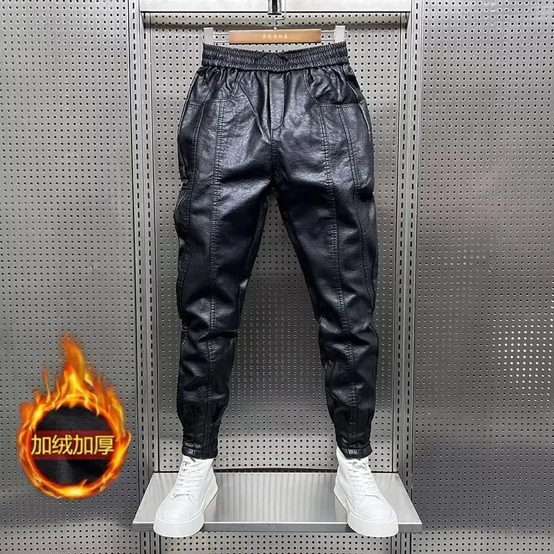 Брюки мужские кожаные в стиле хип-хоп, свободные повседневные Прямые однотонные черные штаны в стиле Харадзюку, брендовая уличная одежда дл...