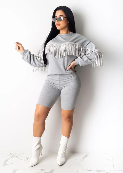 two dress tassels spliced 2 piece set sweat suits women round neck lonmg sleeve slim hoodie and ny knee length pants fall outfits, White