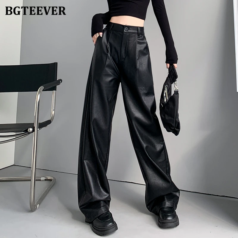 Брюки BGTEEVER женские из экокожи, эластичные Широкие штаны с завышенной талией, стильные свободные однотонные прямые с карманами, Осень-зима
