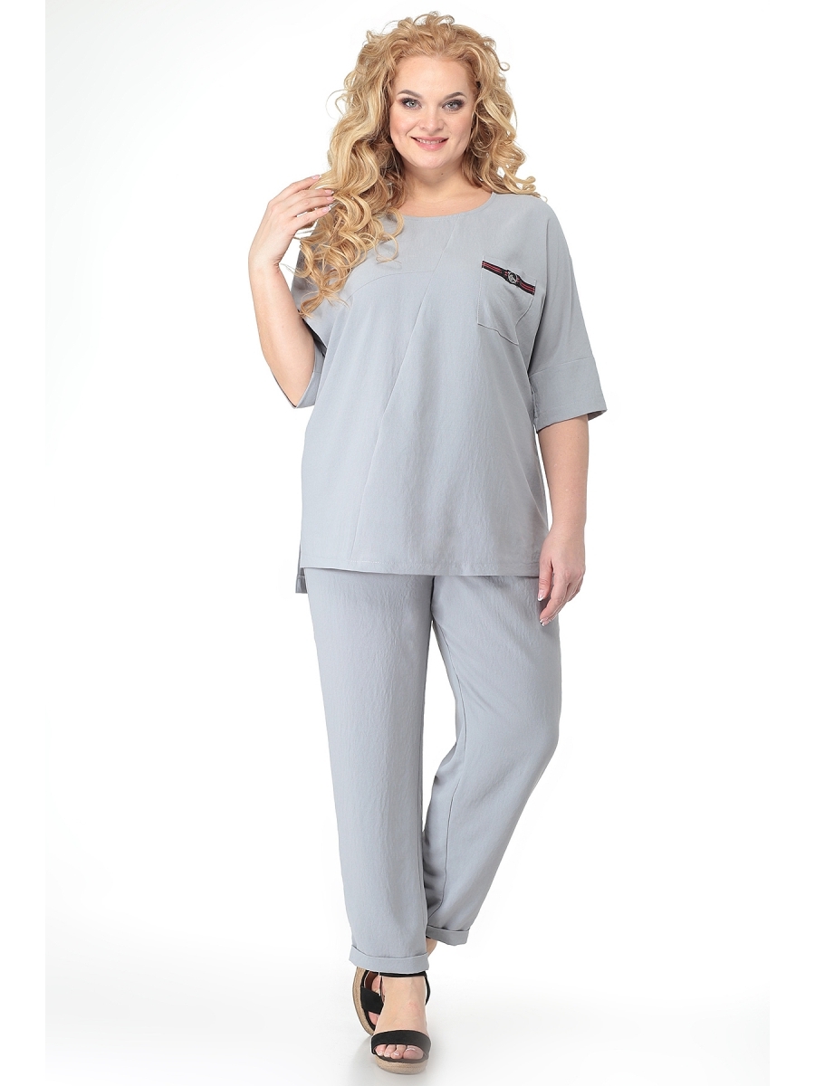 Современная женщина должна выглядеть стильно и уместно в любой ситуации, успевать выполнить все поставленные перед собой задачи. Брючный костюм из ткани с эластаном и эффектом креш, отвечает этим требованиям. Блуза с спущенным плечом и широкой манжетой, перед с асимметричными подрезами по косой. С левой стороны накладной карман с декоративной нашивкой. Спинка со средним швом, длиннее переда на 4 см. В боковом шве разрез. Брюки свободного кроя с поясом на эластичную тесьму, с карманом и складками у пояса. По низу брюк заутюжена манжета.