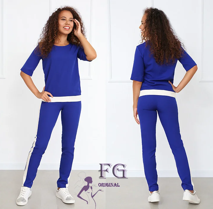 От нашего брючного костюма невозможно отвести глаз!Лаконичная, довольно сдержанная модель плотно не облегает и красиво садится по фигуре. Верх комплекта – кофта прямого силуэта с рукавами по локоть. Кофточка имеет неглубокий круглый вырез горловины и декоративный манжет контрастного цвета. Брюки с лампасами немного заужены к низу. Пояс на мягкой резинке, спереди есть два кармана. Штанины можно подкатывать, зависимо от того, какой обувью вы дополните свой образ.