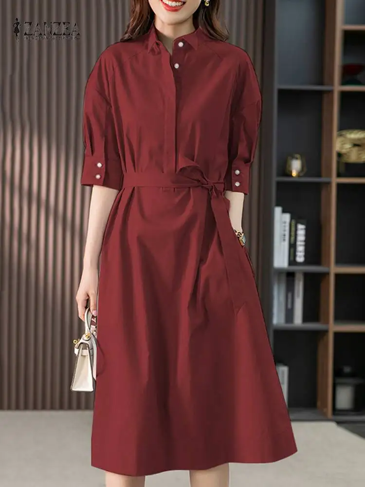 ZANZEA Women Autumn Shirtdress Fashion Short Sleeve Solid Knee-length Dress Elegant OL Work Sundress Robe Femme Kaftan Vestido