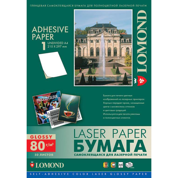 Бумага Lomond самоклеящаяся лазерная глянцевая неделенная A4 80г/м2 (50л) (2610005), Белый, 1 часть
