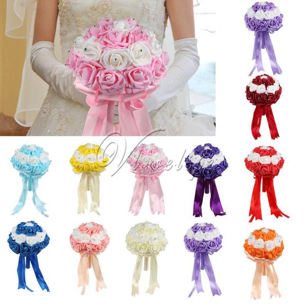 bridal wedding bouquet handmade artificial pe foam rose flowers with rhinestone satin ribbons bow party favors decor
