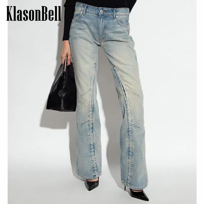 1.24 KlasonBell Streetwear Fashion Hook Button Split Denim Pants For Women Washed Cotton Flare Jeans