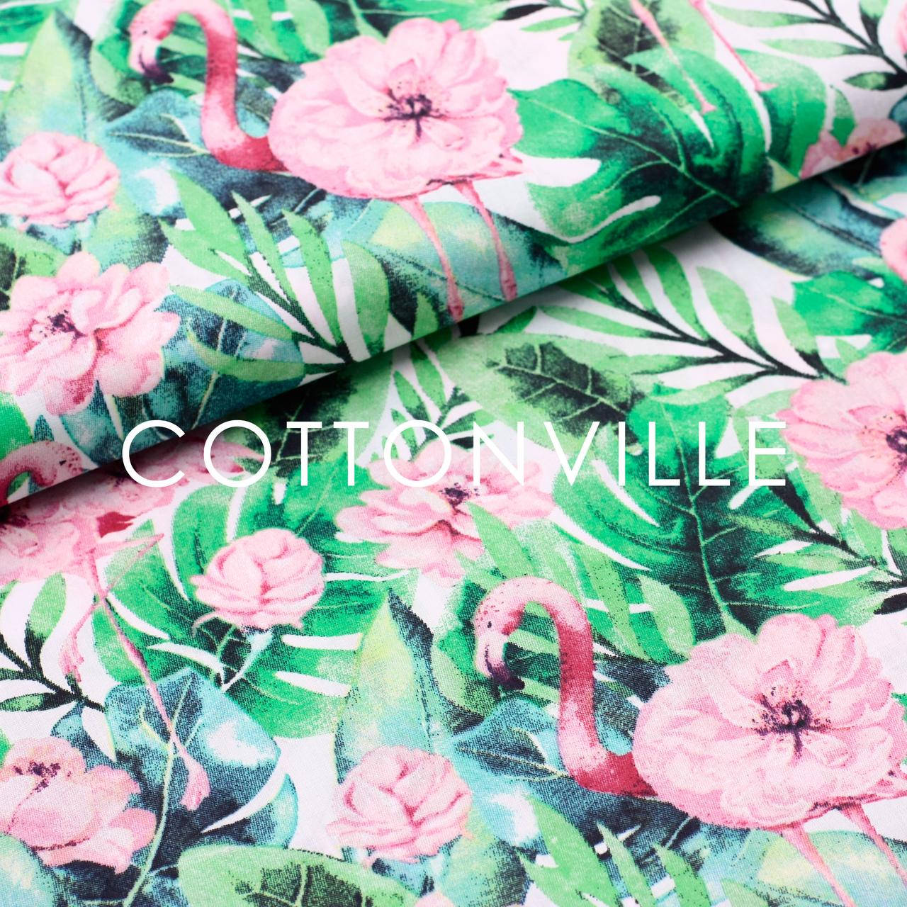 Бязь Фламинго, розовые цветы, Зелёный