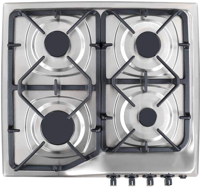 газовая на 4 конфорки, нержавеющая сталь, мощность: 7600 Вт, механический электроподжиг, решетки: чугун, независимая установка, размеры (ШхГ): 59x52 см