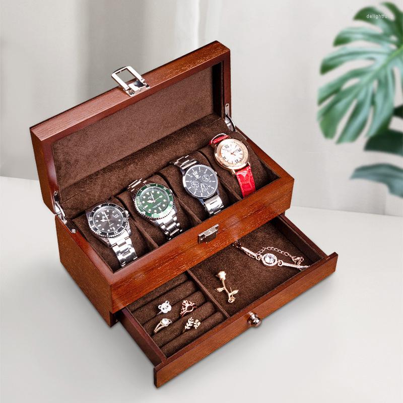 Watch Boxes Double-layer Wooden Organizer Case Brown Men Jewelry Storage Box Display Ring Necklace Bracelet Gifts Cases