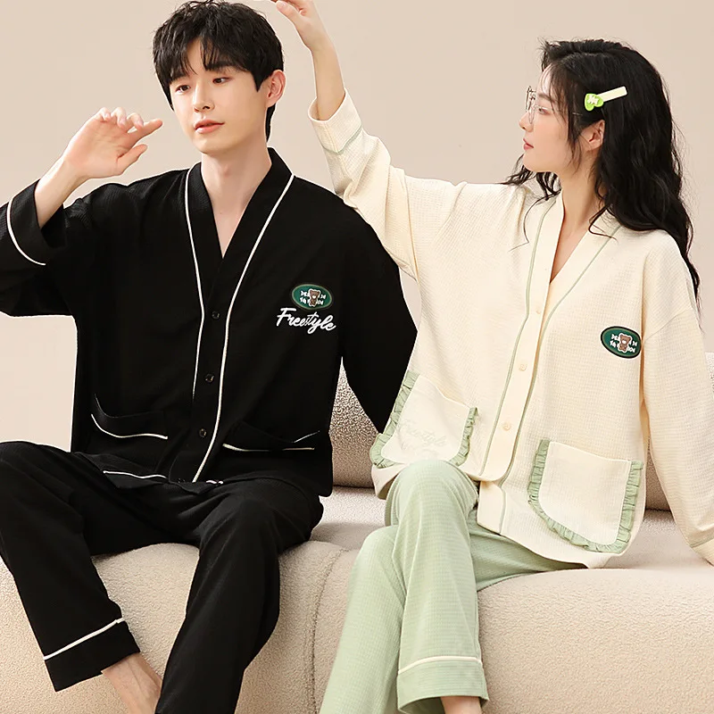 Вафельная хлопковая ночная рубашка для пар, весенний длинный топ для сна, брюки, пижама для женщин и мужчин, домашняя одежда, кимоно, одежда для сна, пижамы, пижамы