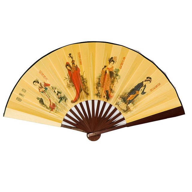 Веер двухсторонний маленький "Девушки". 26х46 см. Желтый. (А4306а)