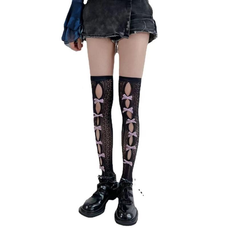 Великолепные носки Лолита с бантом до колена, утягивающие в стиле ретро, милые, крутые, горячие, любимые готические кружевные чулки в сеточку с дырочками One Size фиолетовый