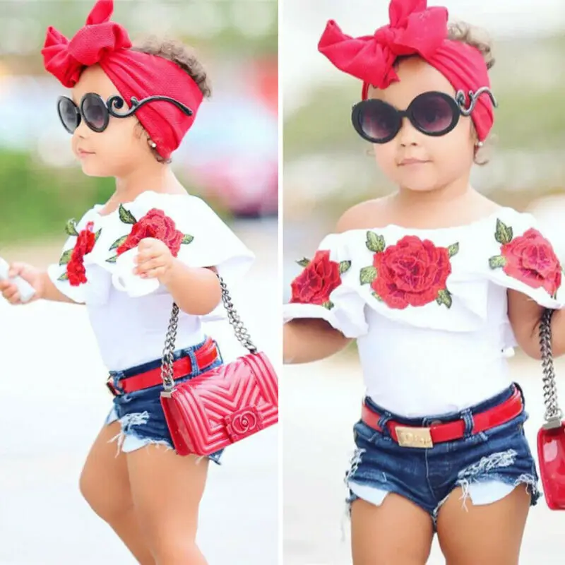 Kids Baby Girl Clothes Off-Shoulder Flower Tops Denim Shorts Outfits Summer