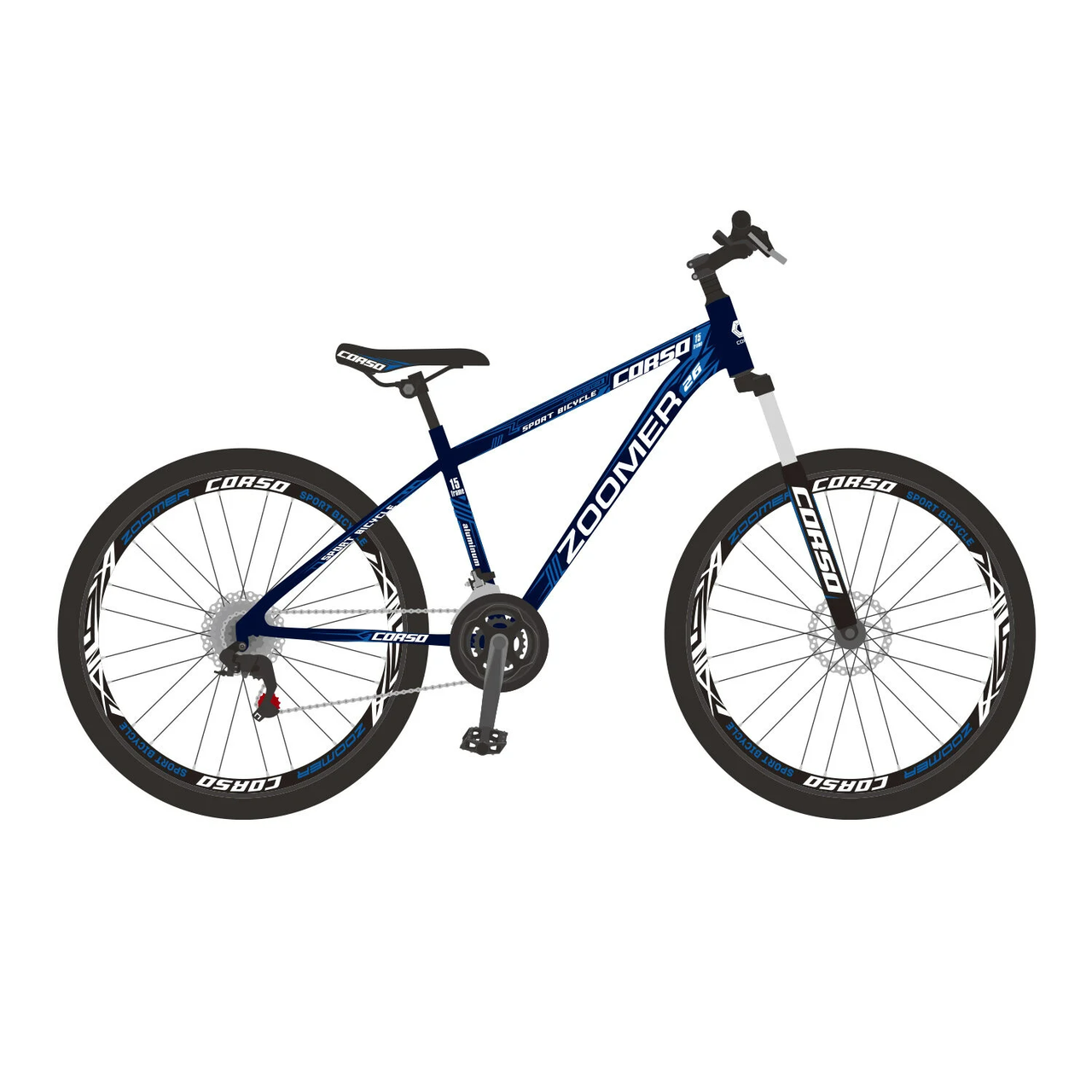 Двухколесный велосипед Corso Zoomer с дисковыми передними и задними тормозами. Облегченная 15 дюймовая рама выполнена из прочного сплава алюминия. Передний амортизатор установлен на вилке переднего колеса. Колеса 26 дюймов из алюминия и двойными противоударными ободами. На велосипеде установлена подножка. Удобное спортивное сиденье с возможностью регулировки высоты и угла наклона. Руль регулируется по высоте. Велосипед имеет 21 скорость с двумя переключателями установленными на руле. Оптимальный рост велосипедиста 155-180 см.
