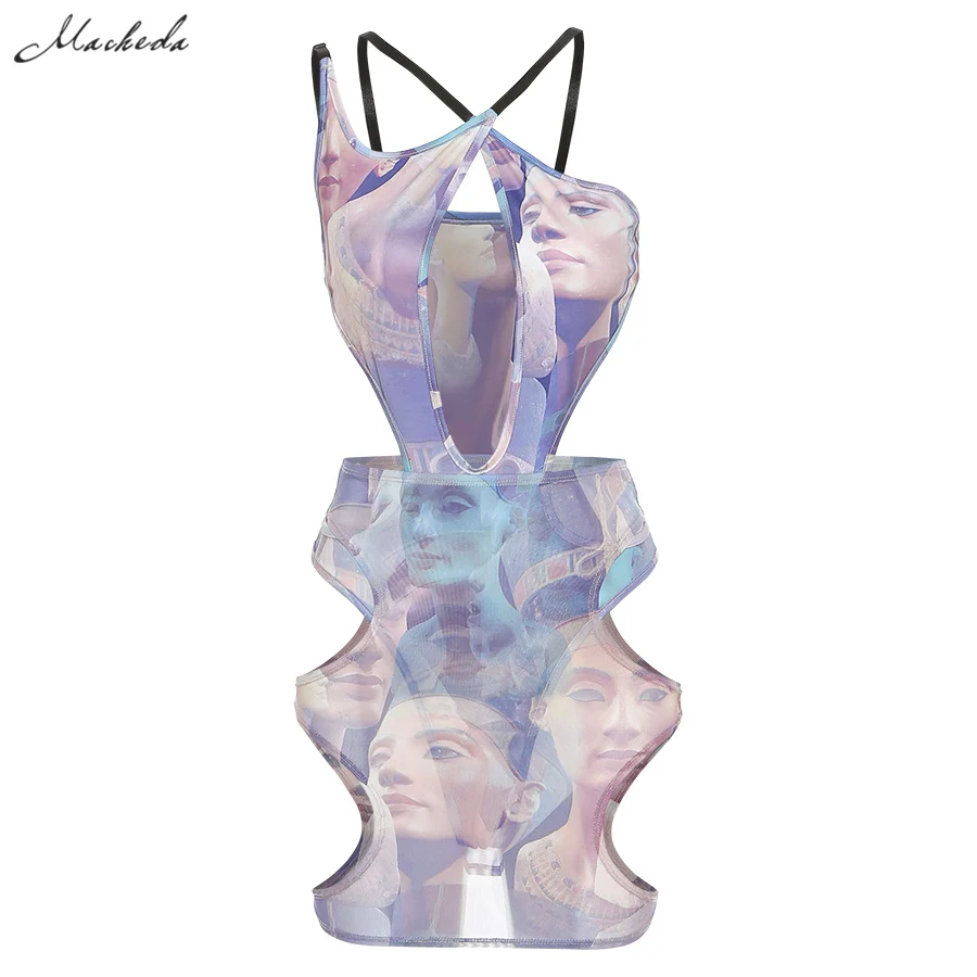 Sexy Hollow Out Slim Two Pieces Set Women printing sleeveless Bodysuit And Mesh High Waist Mini Skirt Outfit 2021 New
