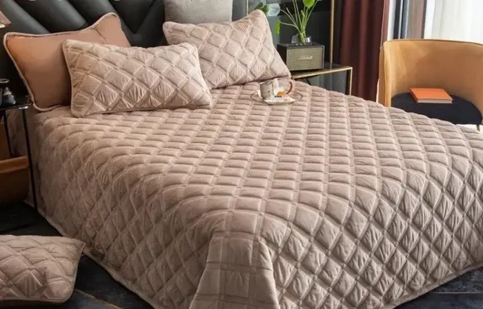 Комплект велюровое покрывало . Лицевая сторона покрывала обладает изысканным шелковым блеском и гладкостью. Полотно прошивается насквозь стежками, создавая выпуклый узор стеганого покрывала. Верхняя часть покрывала сшита из велюра, низ из хлопка, внутри тонкий слой наполнителя.