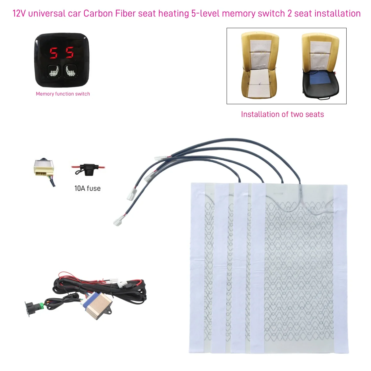 Built-in 12V Car Seat Heater Kit Universal Carbon Fiber Heating Pads 5 Levels Digital Display Control Switch System Fit 2 Seats