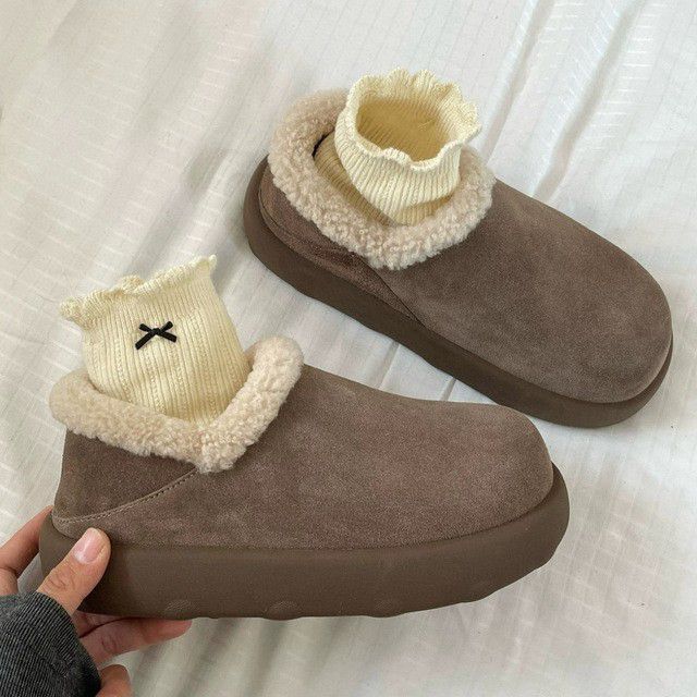 Версия из коровьей кожи 2025 зима новые круглый носок ретро толстая подошва повседневные универсальные бархатные утолщенные теплые хлопковые тапочки женские 40