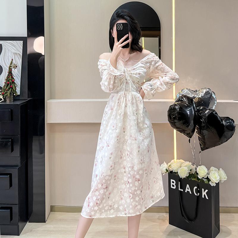 Весеннее шифоновое платье с французским воротником, открытыми плечами, рукавами с оборками и жаккардовым принтом. Medium