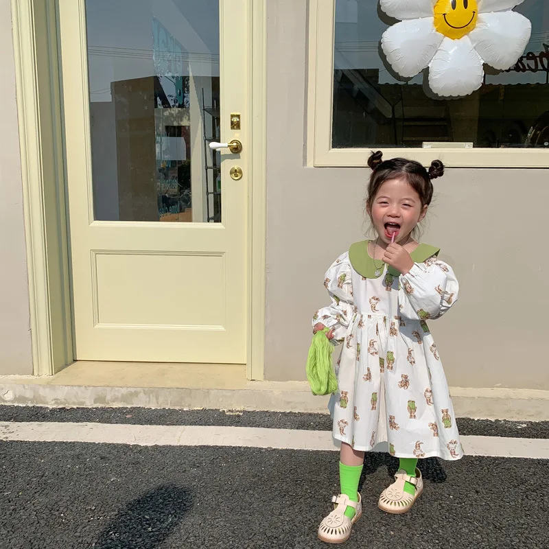 Весенне-летнее платье для маленьких девочек с рисунком медведя из мультфильма с высокой талией в Корейском стиле
