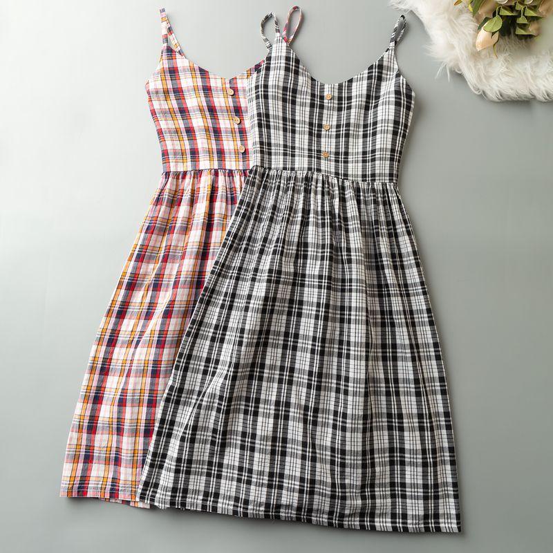 Весенне-летнее экспортное платье K-стиля, новое, простое, универсальное, с высокой талией, стройнящее, с эластичной спинкой и бретелями. Black and White grid All yards